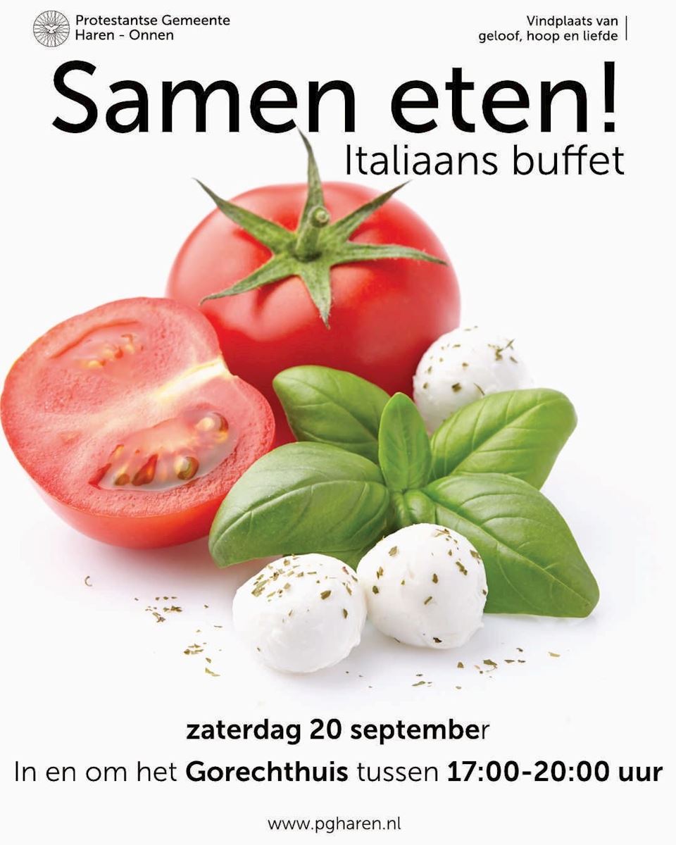 ![]() We nodigen iedereen van de Protestantse Gemeente Haren - Onnen uit om samen te genieten van een heerlijk Italiaans buffet van Ristorante Mediterraneo, inclusief heerlijke desserts! Wanneer: In het startweekend op zaterdag 20september Locatie: In en om het Gorechthuis Tijd: 17:00-20:00 uur Kosten buffet (inclusief drankjes): Eigen bijdrage van €10,- p.p. en voor kinderen t/m 12 jaar €5,- p.p. (Ter plaatse te betalen via pin of met een QR code) Aanmelden graag voor 5 september a.s. via: sameneten@pgharen.nl Eventuele dieetwensen mag u ons ook mailen. Voor vragen kunt u bellen met: Cees Verschoor: 050-5348972 We hopen met alle gemeenteleden een goede start van het nieuwe seizoen te mogen maken! Graag tot ziens op 20 september, Cees Verschoor en Monique van der Molen | ||